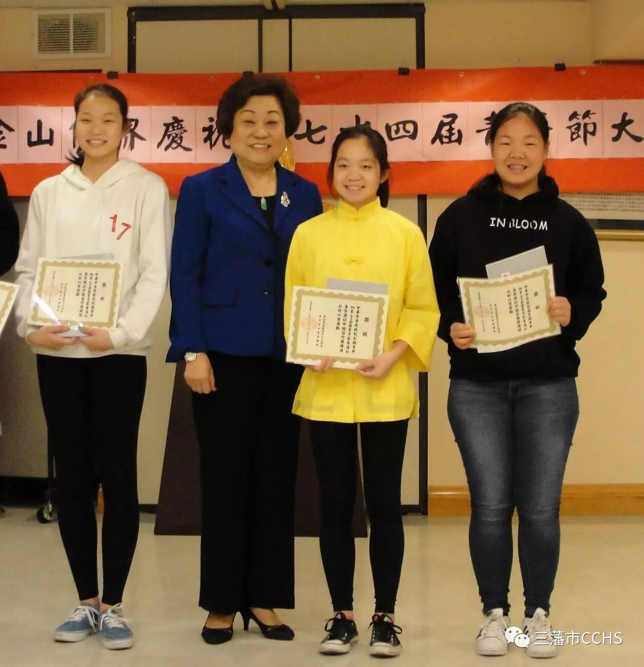 蔡校长、古老师与获奖的欧氏三姊妹合照。