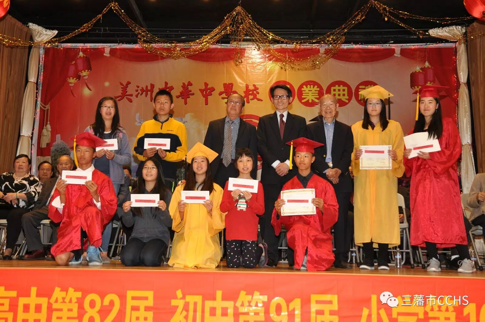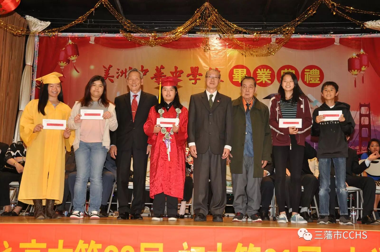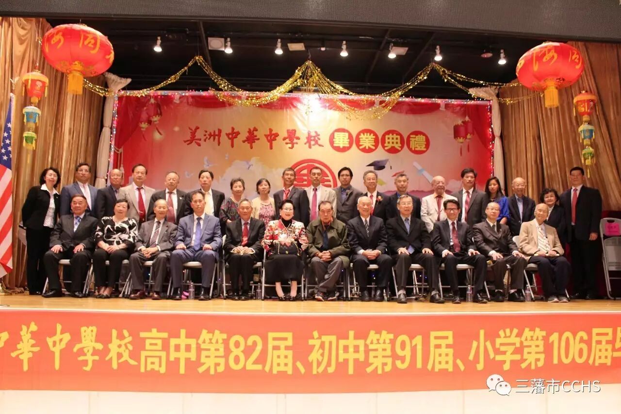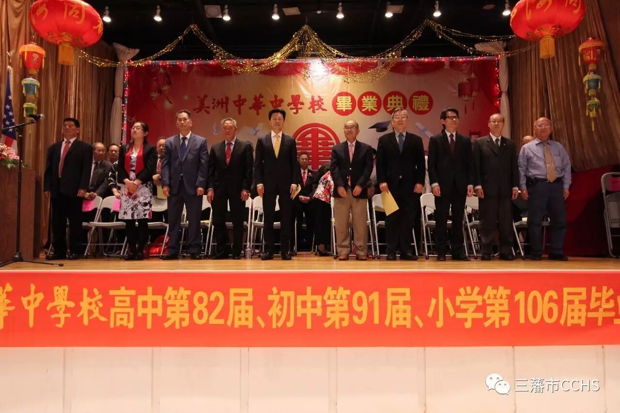 中国驻旧金山副总领事查立友(左5)、副领事孙晓明(左2),中华中学校校董会主席郑文玉、副主席黄中华、校长蔡炳乐、校监李树邦,中华总会馆总董暨宁阳总会馆主席黄惠喜以及肇庆、合和、冈州、阳和、人和等总会馆主席、各侨团领袖、社会贤达和全体教师、全体毕业生家长逾500人出席了典礼。