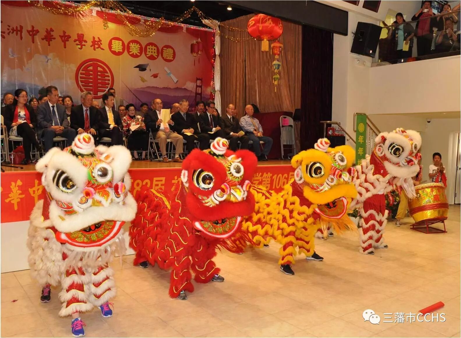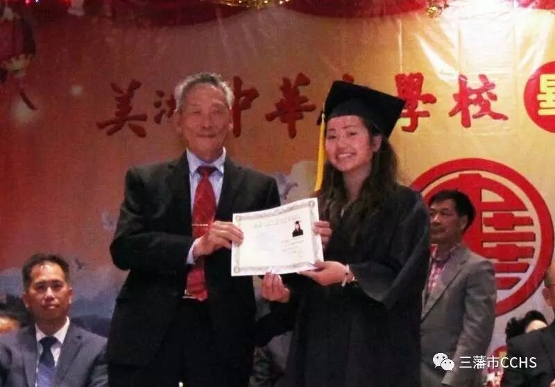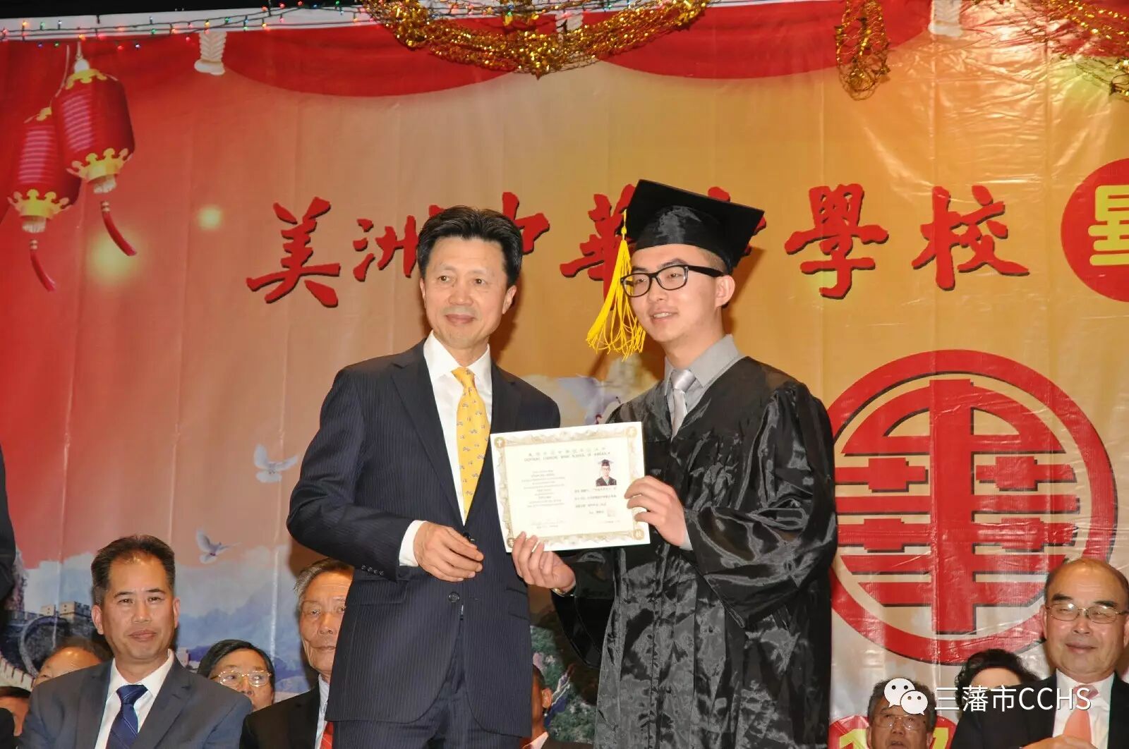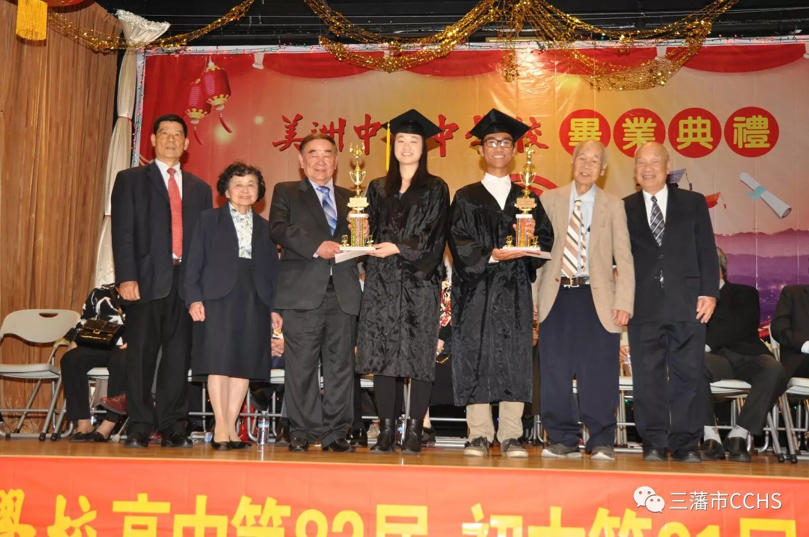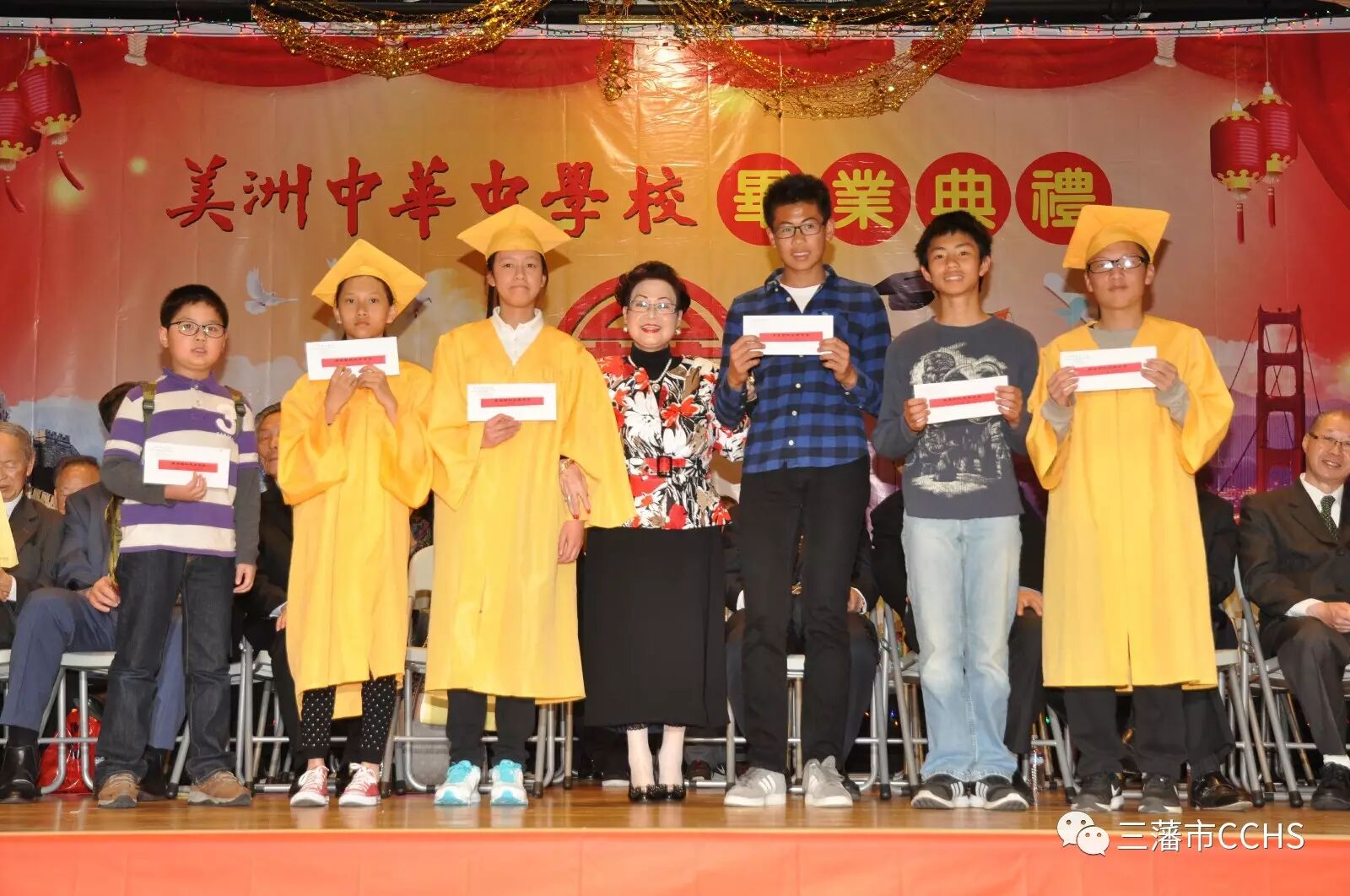 中国驻旧金山副总领事查立友(左5)、副领事孙晓明(左2),中华中学校校董会主席郑文玉、副主席黄中华、校长蔡炳乐、校监李树邦,中华总会馆总董暨宁阳总会馆主席黄惠喜以及肇庆、合和、冈州、阳和、人和等总会馆主席、各侨团领袖、社会贤达和全体教师、全体毕业生家长逾500人出席了典礼。